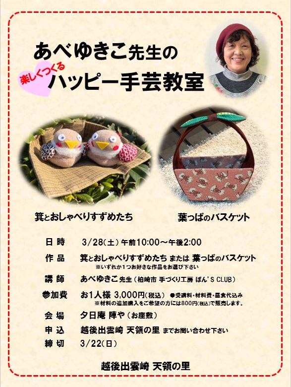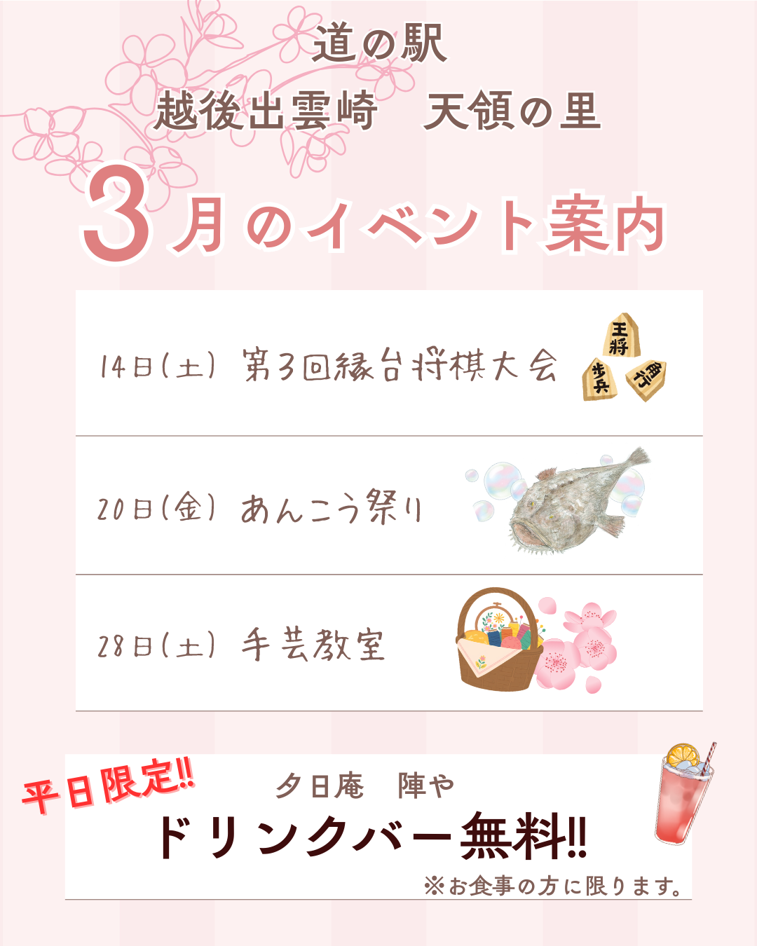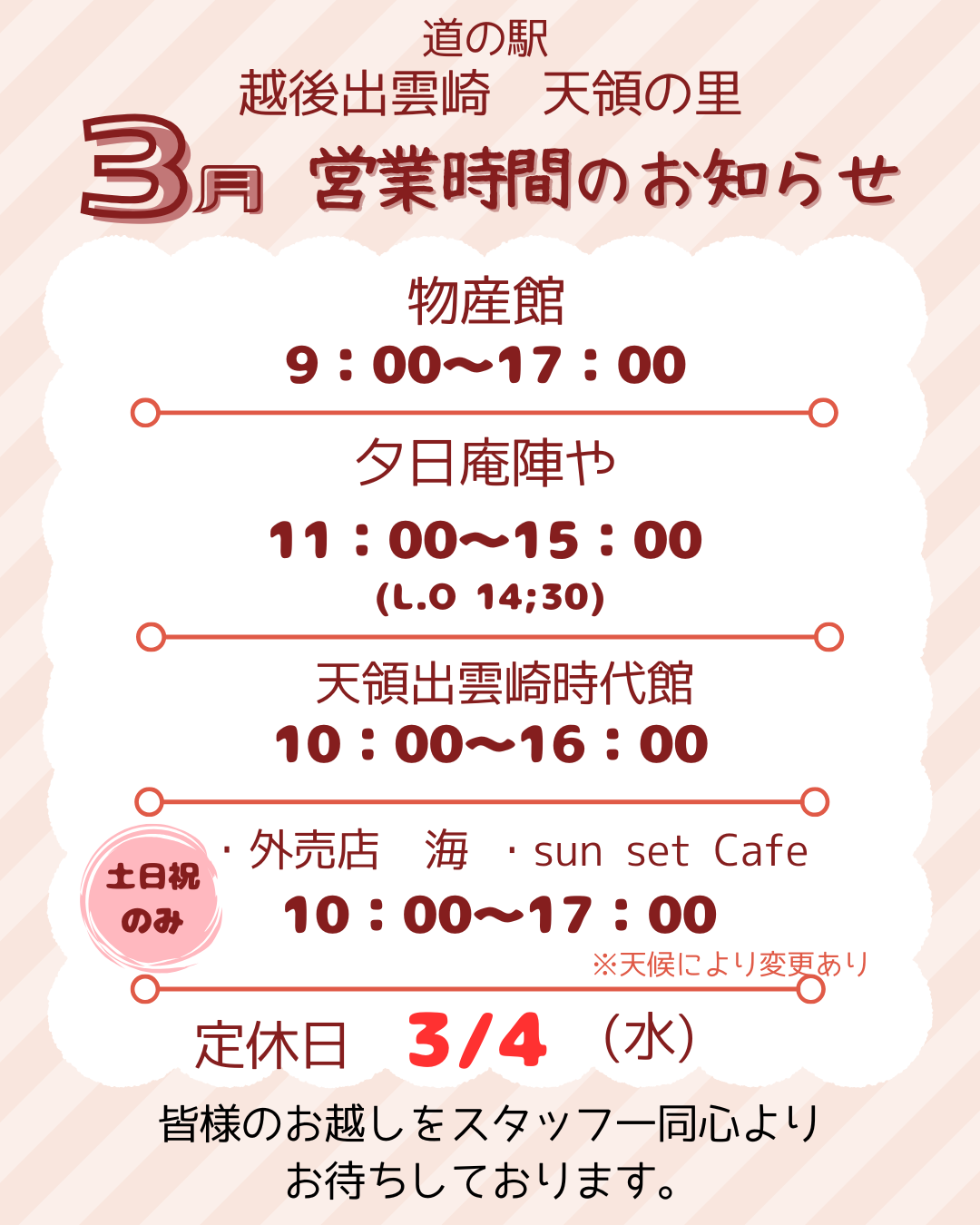 道の駅 越後出雲崎 天領の里より、3月のイベント・営業時間のお知らせです。